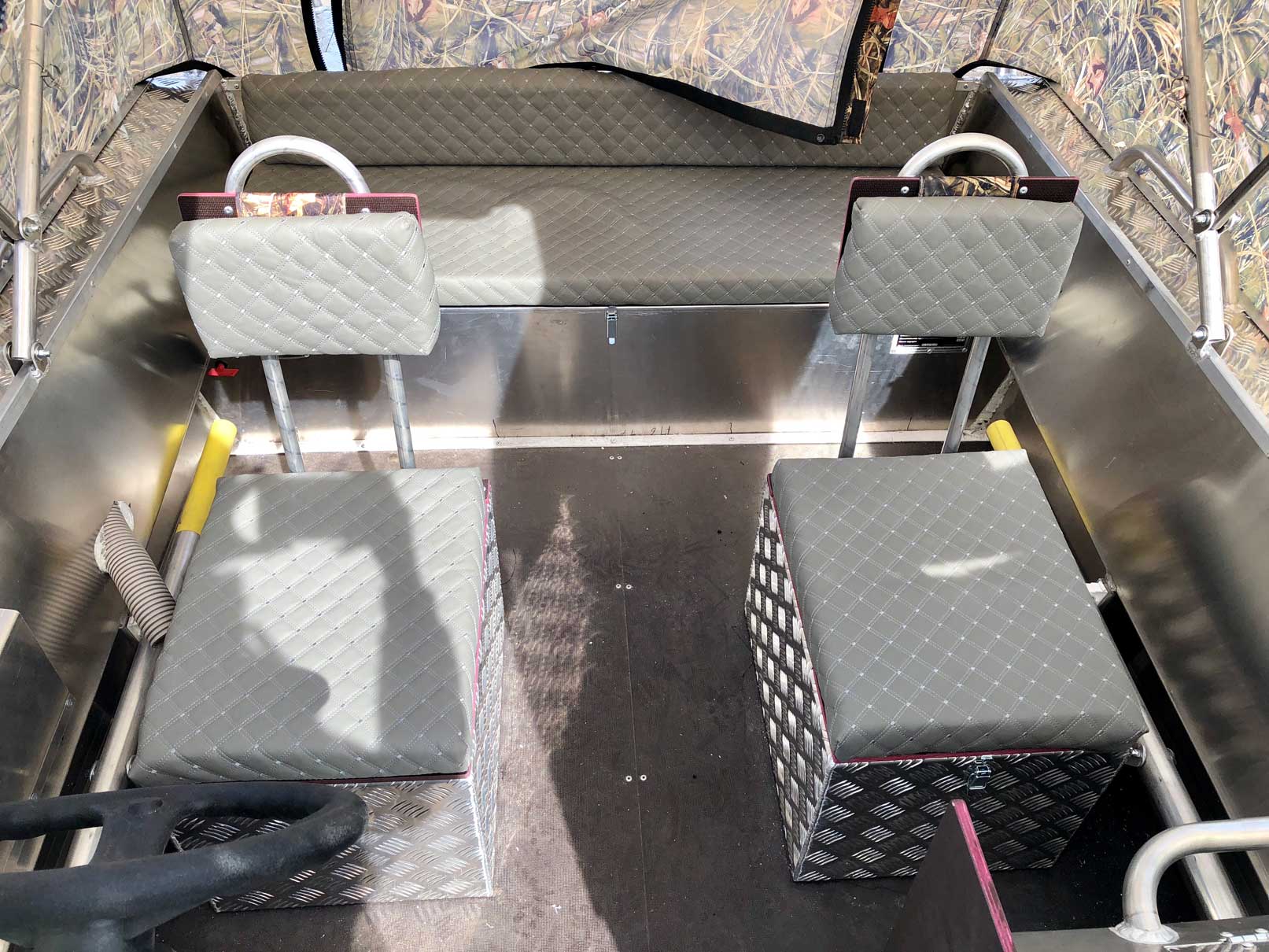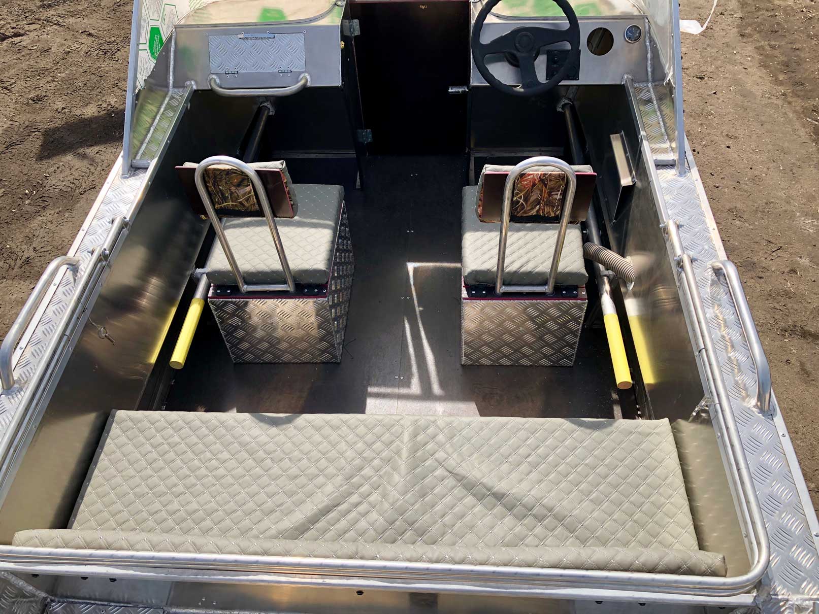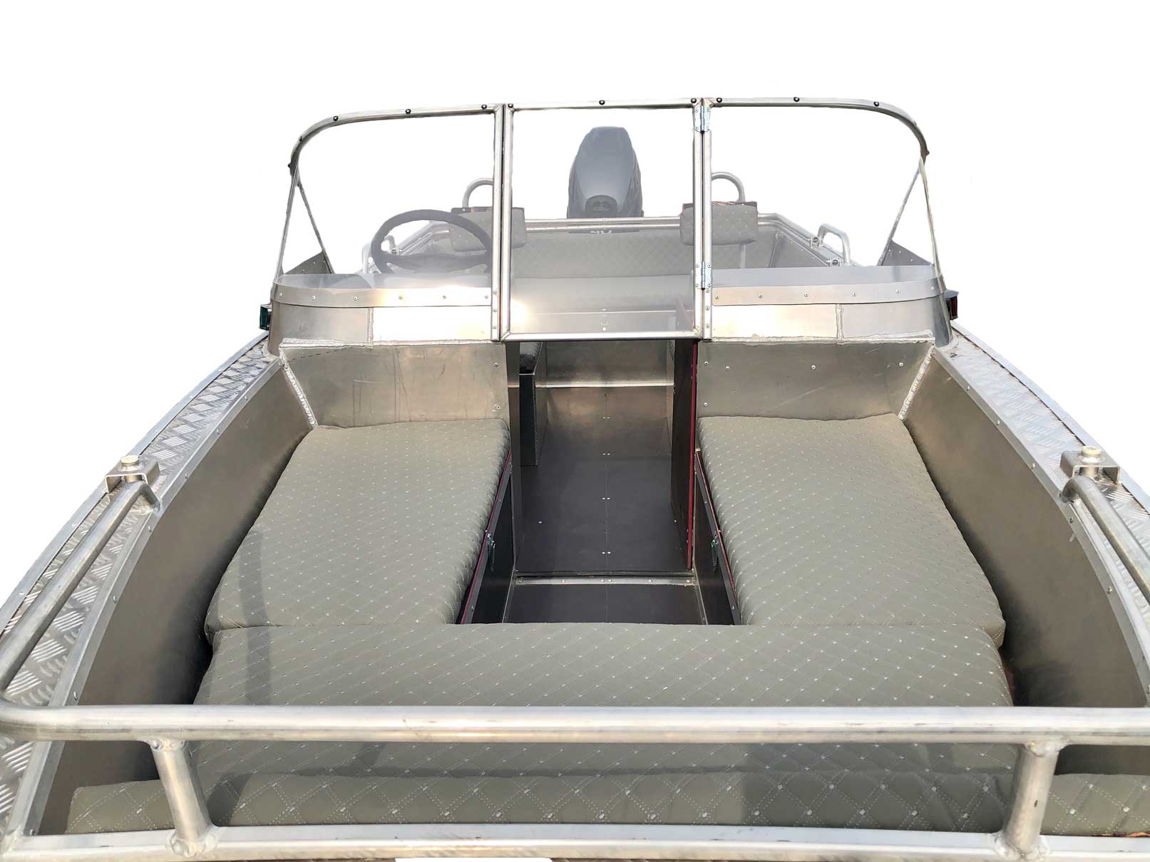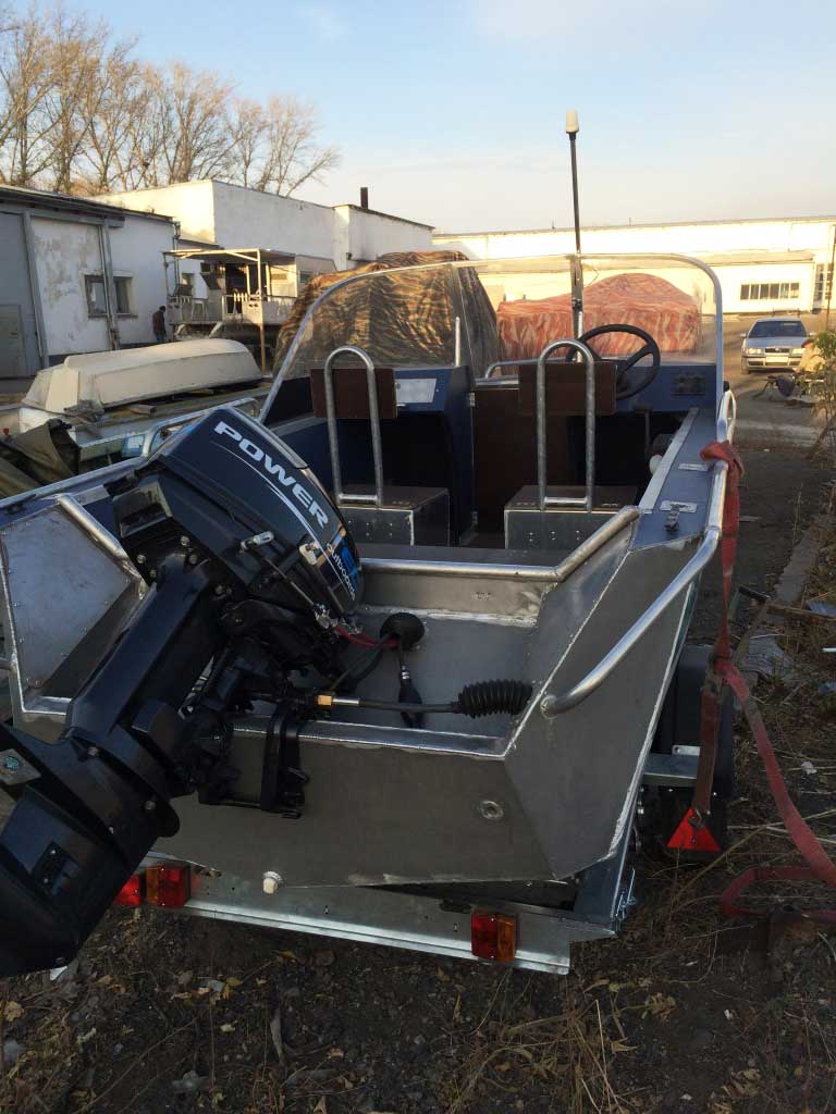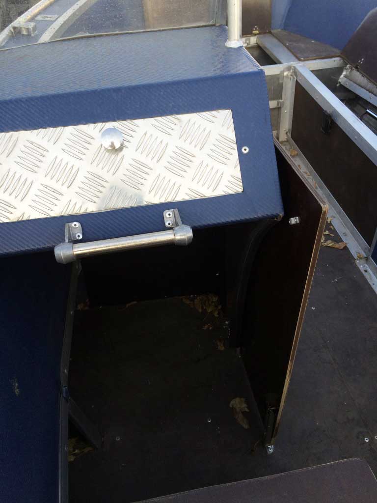 - Алюминиевая панель управления катером состоящая из двух консолей, в комплекте (рулевой редуктор, штурвал, рулевой трос, дверца прохода в носовой кокпит)