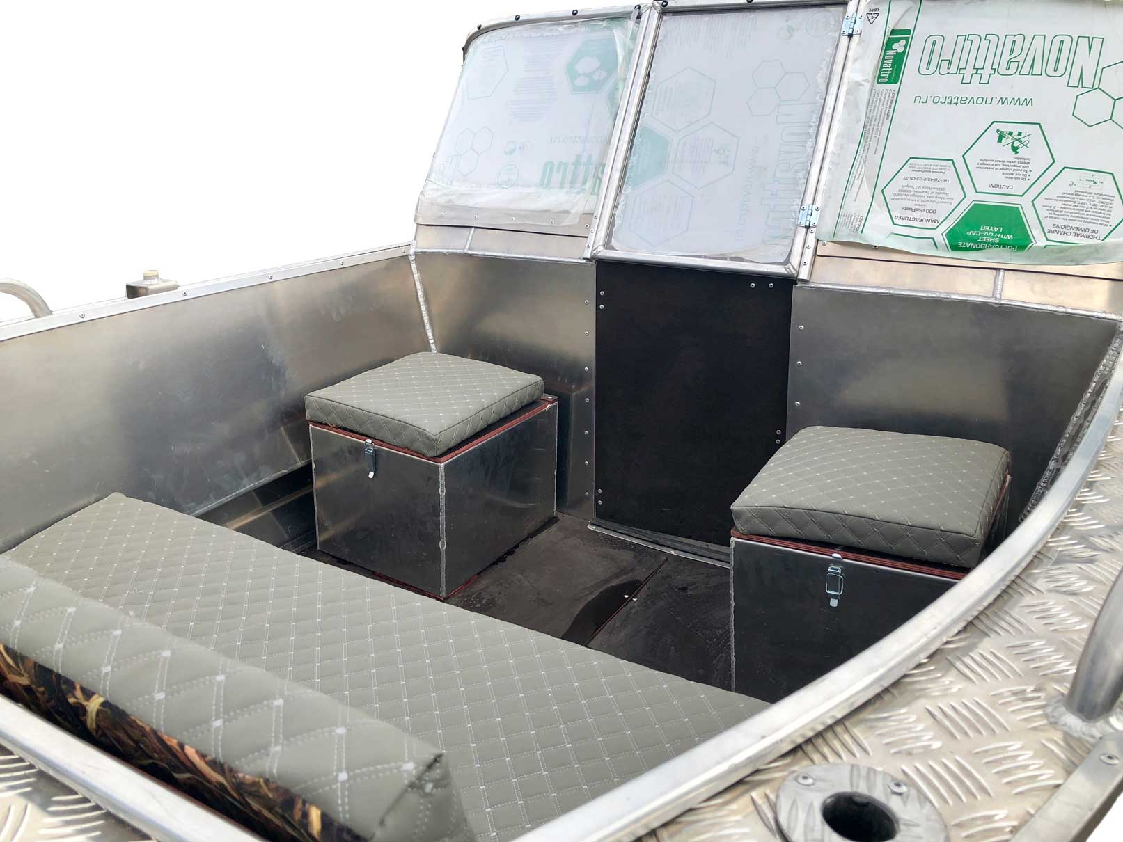 - Носовой кокпит оборудован сиденьем с рундуком для хранения вещей и оборудования